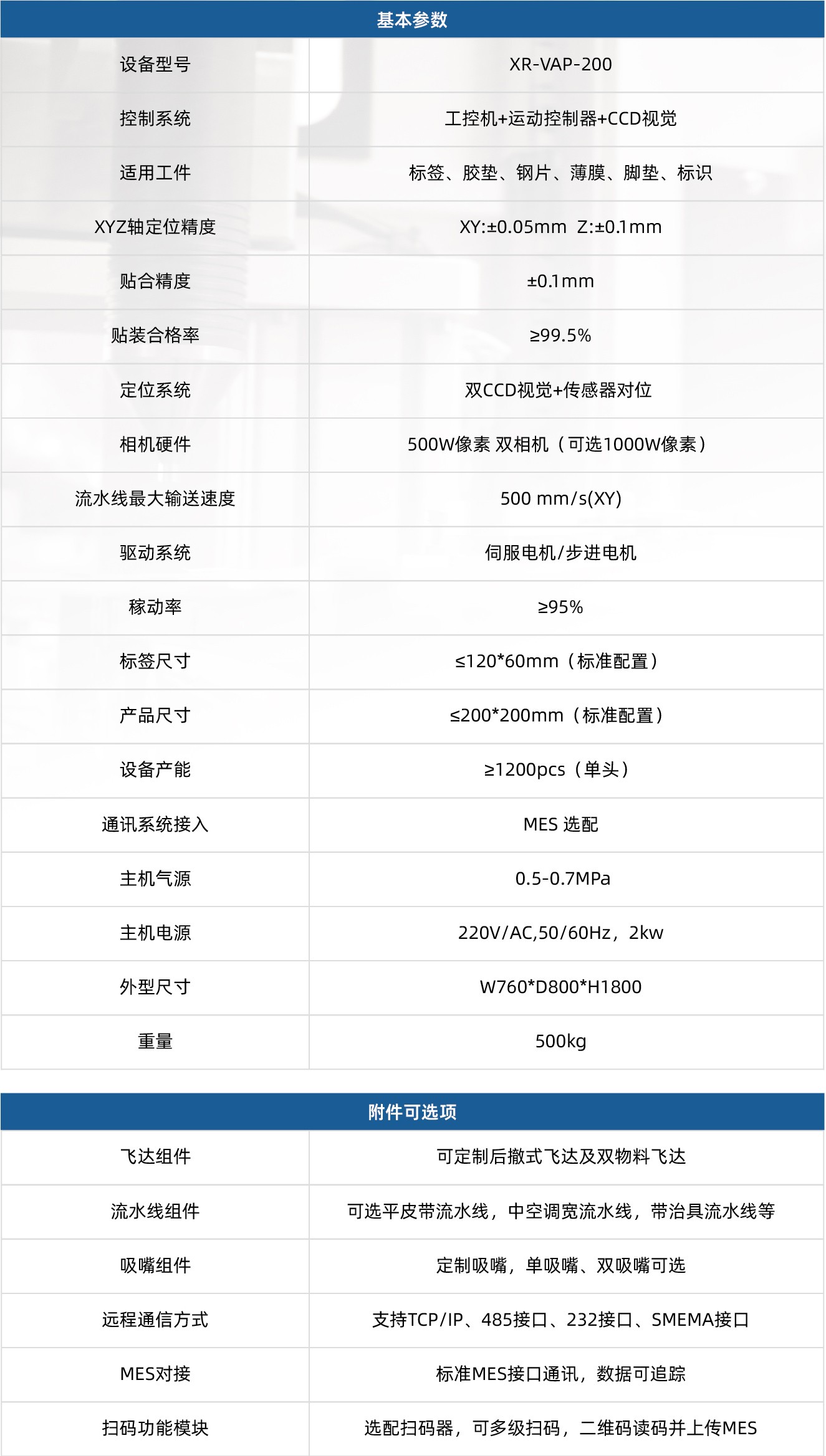 ·Online fully automatic visual product positioning with no restrictions on product direction. Optional dual nozzle feeding and dual Feida feeding can be used, and different materials can be conveyed on the assembly line without the need for tooling, with high universality. Label auxiliary materials can be peeled off by Feida, CCD visual secondary alignment can be achieved with high precision. Productivity can be improved by reducing manual intervention and increasing equipment utilization rate. Multi functional collection. Optional MES communication and equipment remote communication protocols can be used to upload important parameters of equipment operation in real time. Application range: labels, auxiliary materials, foot pads, and films can be attached to devices such as mobile phones, tablets, laptops, toys, smart terminals, medical equipment, security products, industrial accessories, TP, etc